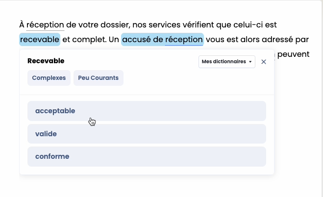 Vous gagnez du temps. Repérer qu’un mot est complexe, c’est une chose. Trouver le bon synonyme qui colle au contexte de votre phrase, c’en est une autre. Lisible vous propose directement des alternatives en langage clair. Vous n’avez plus à chercher.